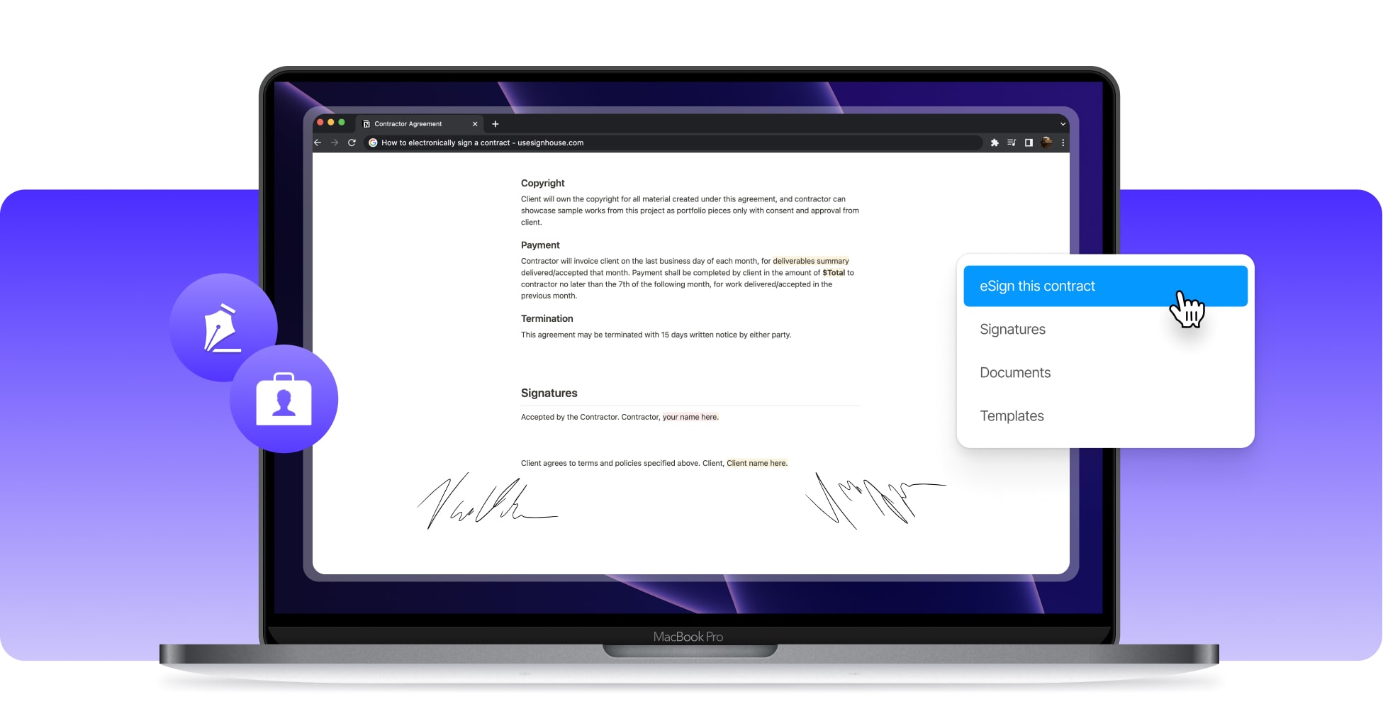 Whether you know how to work on a computer or not, we guarantee that you can digitally sign contracts. Our product is built in such a way that it's easy for every individual to eSign an online contract. It's all intuitive!