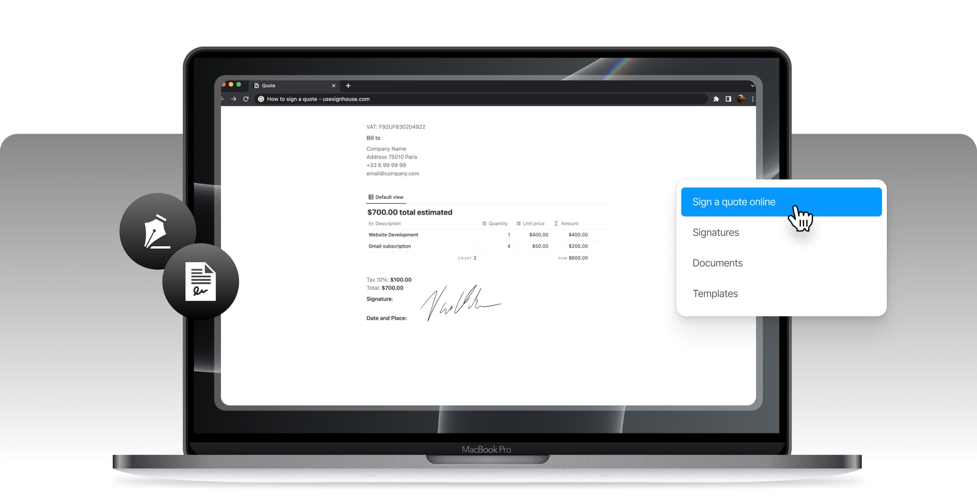 Signing an online quote requires that you have an electronic signature first. To make your electronic signature, use an online eSignature maker such as SignHouse. After creating your online signature, simply upload the document of the quote, and attach your signature anywhere within the file. That’s right about it!